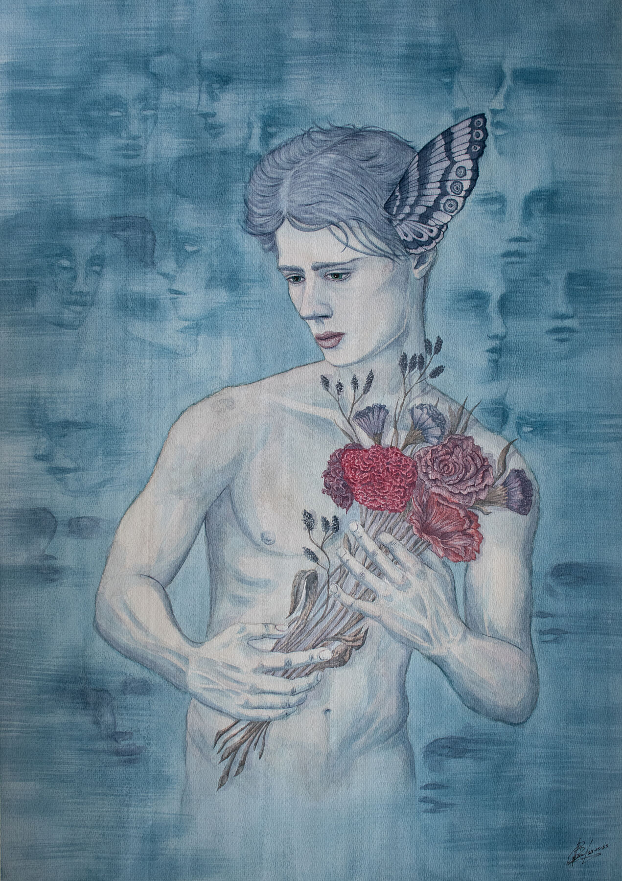 Introspectiva sobre la complejidad de los vínculos interpersonales dentro del colectivo LGTBIQ+. Una oda a la soledad derivada de los superfluo. Acuarela sobre papel.